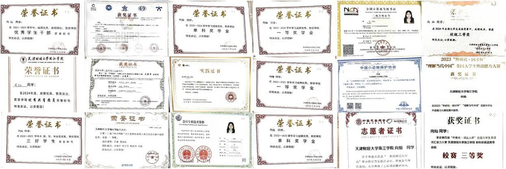 在学习中,她严于律己。在校期间获得一等奖学金、单科奖学金、三好学生等,一次性通过初级会计考试,全国计算机等级考试、取得英语四、六级证书。她积极参加各类竞赛,获得了第十二届网中网杯大学生财务决策大赛荣获国家一等奖、一带一路暨金砖国家技能发展与创新大赛财经素养大赛荣获国家一等奖,第十二届“学创杯”全国大学生创业综合模拟大赛财务决策模拟赛项荣获省赛二等奖等。