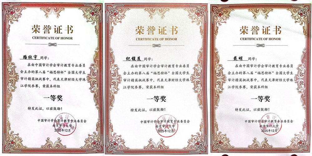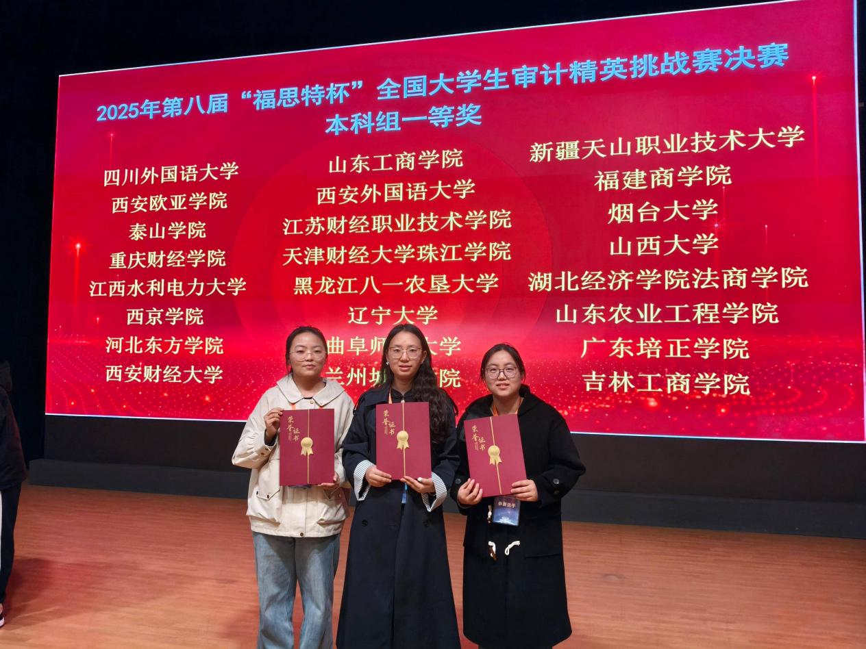 近日,第八届“福思特杯”全国大学生审计精英挑战赛总决赛在南京审计大学圆满落幕。由审计2302班戴明、审计2304班纪馥蕉、财管2302班路欣宇三名同学组成的代表队,在李梓晴、樊嘉钰和汤小芳老师的共同指导下,凭借扎实的专业基础、出色的协作能力以及稳定的现场表现,荣获全国一等奖。